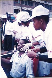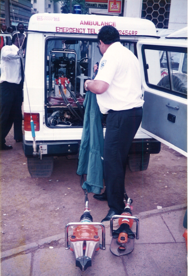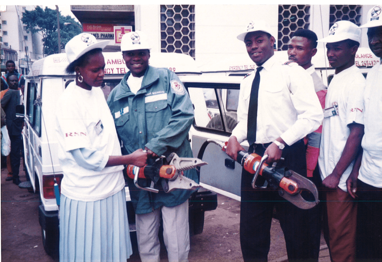 Head Nurse Clarice demonstrating with Road Safety Network personnel on the handling of Holmatro:
